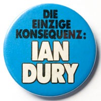 ian dury - badge - "die einzige konsequenez:" in black text - "ian dury" in white text - both on blue background badge - 1.5" diameter - circular