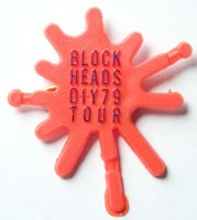 ian dury - badge - BARNEY BUBBLE DESIGNS - block heads d-i-y 79 tour - red plastic "splash" with blue text badge -
