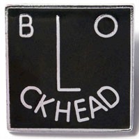 ian dury - badge - blockhead clockface graphic logo with blue text out of blue square on blue background - maybe barney bubbles design badge - 1.25" diameter - circular